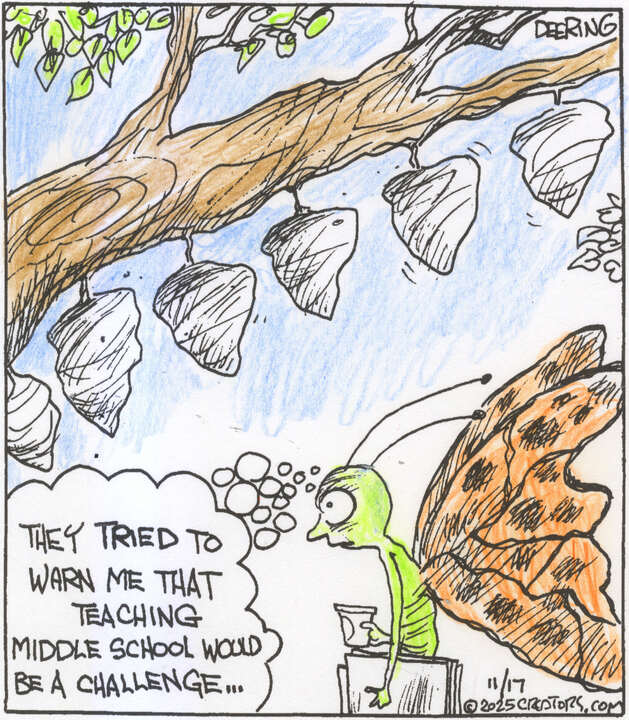 At the Democrat-Gazette, Deering advanced from layout artist to editorial cartoonist in 1981-82. His promotion to chief editorial cartoonist in 1988 made his cartoons the state's best-known. Deering also creates the comic panel Too Much Coffee.